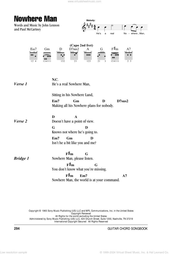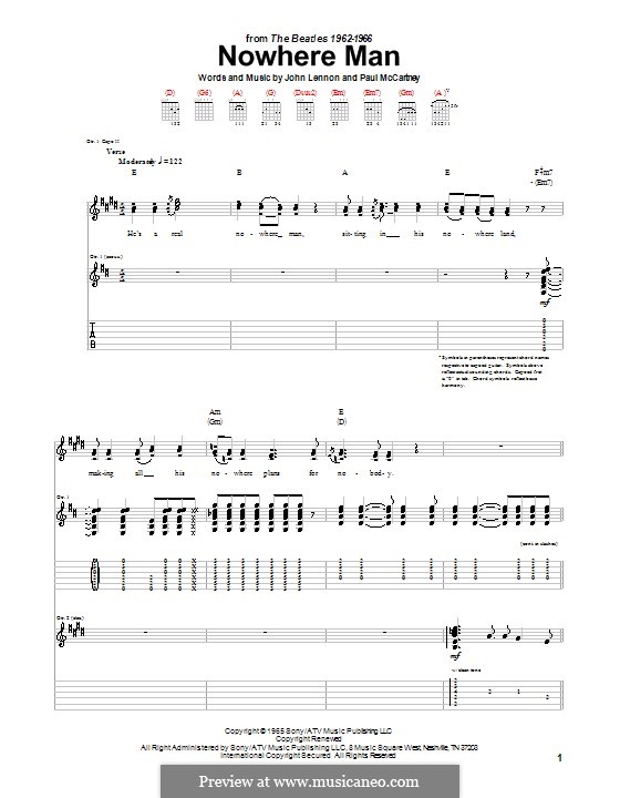 Create and get +5 IQ. Nowhere Man chords The Beatles * Capo II [Verse 1] D A He's a real nowhere man G D Sitting in his nowhere land Em Gm D Making all his nowhere plans for nobody [Verse 2] D A Doesn't have a point of view G D Knows not where he's going to Em Gm D Isn't he a bit like you and me?